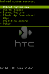 Hurá, recovery mód funguje. Doporučuji si přečíst dokumentaci k Amon_RA, ať zhruba tušíte co to umí. Myslím že teď je i každému jasné jak nahrát zpět původni HTC recovery.