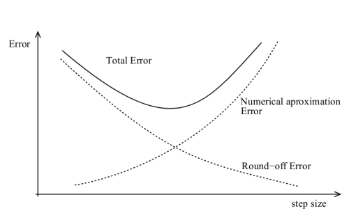 Přesnost výpočtu je závislá na velikosti integračního kroku. Neplatí však, že čím menší krok, tím vyšší přesnost. Při zmenšení kroku pod určitou hodnotu dojde k velkému nárustu chyby numerické aproximace (je to záležitost toho jak počítač reprezentuje data a že bude mít málo platných číslic – viz reprezentace desetinných čísel). Obrázek ilustuje hledaní ideální délky kroku.