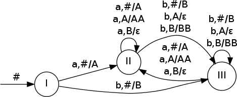 Navrhněte deterministický zásobníkový automat přijímající jazyk L z příkladu 6. Přechodovou funkci znázorněte graficky. Automat může mít maximálně 4 zásobníkové symboly a 4 stavy. Demonstrujte přijetí slova abba.